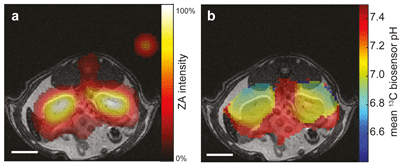 Nieren (a) und niedrigere pH-Werte in der Niere im Vergleich zum umliegenden Gewebe (b).