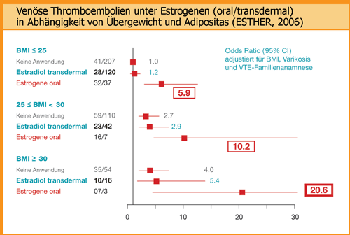 Dass auch Übergewicht und Adipositas gravierende Risikofaktoren darstellen, zeigt eine Nachfolgestudie. Bei Frauen mit einem BMI bis 25 kg/m2 wurde unter oralen Estrogenen ein fast sechsfaches Risiko (OR 5,9) ermittelt (transdermal 1,2). In der "Gewichtsklasse" zwischen 25 und 30 stieg es auf das Zehnfache (OR 10,2, transdermal 2,9). Bei noch höherem BMI berechnete sich für die oralen Estrogene ein rund 20-faches Risiko (OR 20,6, transdermal 5,4)(Abb.).