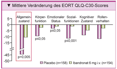 Mittlere Veränderung des EORTC QLQ-C30-Scores zur Lebensqualität nach 96-wöchiger Behandlung mit Ibandronat i.v. im Vergleich zum Ausgangswert (Null-Linie) und im Vergleich zu Placebo (Diel IJ, 2010).
